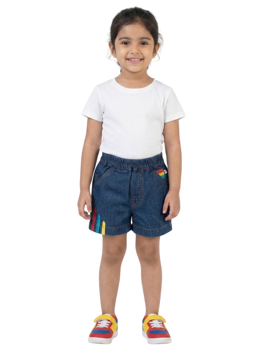 Dress your little one in comfort and style with Pranava Organic Cotton Denim Shorts. Crafted from soft, breathable organic cotton denim, these shorts are gentle on your child’s skin and perfect for everyday wear. Designed with a flexible elastic waistband for easy wear and playful multicolor embroidery accents, they combine sustainability with fun fashion.